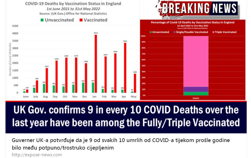 Službene brojke koje je objavila vlada Ujedinjenog Kraljevstva otkrivaju da je potpuno/trostruko cijepljena populacija odgovorna za više od 9 od svakih 10 smrtnih slučajeva od Covid-19 u Engleskoj tijekom prošle godine, 91% svih smrtnih slučajeva od Covid-19 od početka 2022. i 94% svih smrtnih slučajeva od Covid-19 od početka travnja 2022.