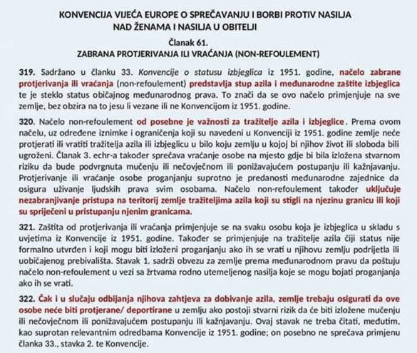 321. Zaštita od protjerivanja ili vraćanja primjenjuje se na svaku osobu koja je izbjeglica u skaldu s uvjetima iz Konvencije iz 1951. Također se primjenjuje na tražitelje azila čiji status nije formalno utvrđen i koji mogu biti izloženi proganjanju ako ih se vrati u njihovu zemlju podrijetla ili uobičajenog prebivališta. Stavak 1. sadrži obvezu za zemlje prema međunarodnom pravu da poštuju načelo non-refoulement u vezi sa žrtvama rodno utemeljenog nasilja koje se mogu bojati proganjanja ako ih se vrati.