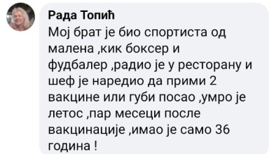 Zaboravio sam dodati da sam svom rođenom bratu poslao upozorenje nije me poslušao primio je cjepivo fajzer nakon koga se razbolio od srca, upala srčane maramice. Operiran, zamenjeni srčani zalisci i stavljen pejsmejker međutim stanje mu se pogoršalo i prošle godine je preminuo u 11 mjesecu ,1972. godište. Majka me takođe nije poslušala primila je dve doze Kineskog cjepiva i bila se razboljela teško, nju sam uspio da izvučem. Zašto sam ovo napisao išli su sa terorom straha svi mediji za masovne komunikacije sami stožeri i sami prodani lječnici svaka čast malom broju izuzetaka. Manipulacija strahom je dala očekivane rezultate sada smrt ubire svoje plodove vještom i podmuklom manipulacijom onih koji su trebali brinuti o zdravlju ljudi. Hvala vam na pažnji.