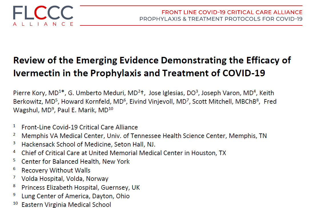 U studiji se preporučuje hitno usvajanje Ivermektina u liječenju COVID pacijenata na temelju više od 20 neovisnih trial studies-a. Npr. jedan od trial-a je obavljenj u Argentini, vođen od Dr. Hector Carvallo-a, sa sljedećim ishodom: od 1200 sudionika ukupno, medicinskih radnika, od 800 onih koji su "bili na" Ivermektinu, nijedan oboljeli. Od ostalih 400 koji nisu uzeli Ivermektin, 240 (blago ili teže) oboljelih. Dakle, nakon tri runde recenzija s četiri recenzenta i prihvaćanja, Frontiers in Pharmacology miče studiju s objašnjenjem da su stanoviti "vanjski eksperti" pronašli neosnovane tvrdnje u studiji. Svatko tko se razumije u postupak vršnjacke recenzije vidi da je ovo flagrantna povreda znanstvene procedure. Srećom, nakon ponovnog slanja u American Journal of Therapeutics, članak je nedavno prihvaćen za objavu i uskoro će se vjerojatno pojaviti na njihovom website-u (tekst u privitku).