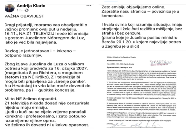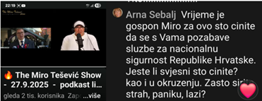 Bila je subota, 27. rujna 2025. Od prijateljice sam upozorena da „bacim oko“, malo poslušam ovog gospodina. Jesam. I ovo sve nije dobro. Dezinformacije, čista propaganda, čak i laži, a tek strah i panika koju širi ne samo u Hrvatskoj već i u okruženju. Što radi, za koga sve ovo? Ozbiljno radi strašnu manipulaciju i propagandu. I sve to čak iz Norveške. Napisala sam i komentar no nije prošao jer sam i tamo odmah blokirana. Čega se boji? ISTINE? Pobogu, jel ovo sve moguće?