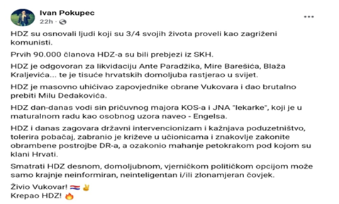 u tome sudjelovao? A o tom devastiranju govori bez imalo grižnje savjesti. Širi mržnju koju trebaju prihvatiti svi Hrvati.