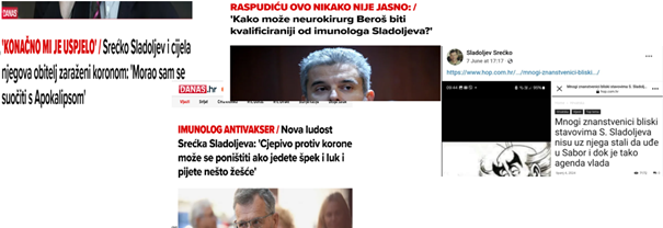 Primjer za ovaj moj navod je ing. Sladoljev, koji nikada nije demantirao navode medija da nije imunolog već ing. biologije. Te da nikada nije bio ravnatelj Imunološkog zavoda, već nakon dolaska sa „tečaja“ UN-a samo voditelj Odsjeka proizvodnje interferona neko vrijeme, „dok ga nije uništio“, kako tvrde i danas neki djelatnici Imunološkog. Prijepiske s ljudima na FB koji kao i većina o tome ništa ne znaju i dan danas vodim. I sama sam bila obmanuta 2020. radeći veliki intervju i vjerujući svemu rečenom ing. Sladoljevu. A o direktnom napadu ing. S. S. nakon smrti moje kćerke, pred izbore 2023., i to na portalu HOP što je bilo nevjerojatno.