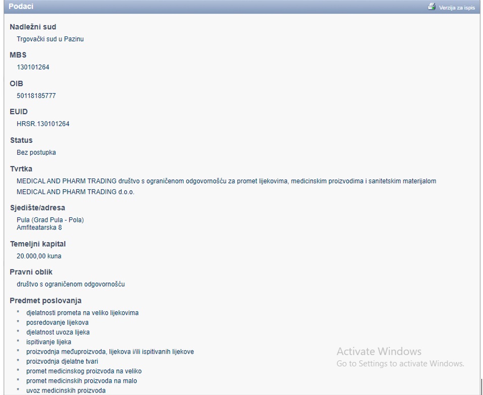 Kako sam pisala u prvom dijelu ove velike afere, financijskog, pravosudnog, političkog i međunarodnog skandala, samo rijetki u Hrvatskoj mogu dobiti u registraciji svoje tvrtke djelatnosti kao tvrtka „MEDICAL AND PHARM TRADING d.o.o. za promet lijekovima, medicinskim proizvodima i sanitetskim materijalom“ iz Pule braće: