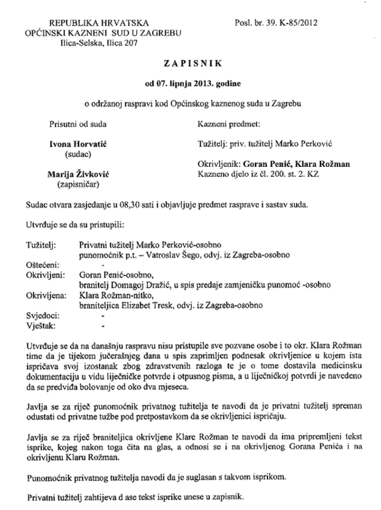 U nastavku je Zapisnik sa navedenog ročišta od 07. lipnja 2013. (izvor: službene web stranice Marka Perkovića)