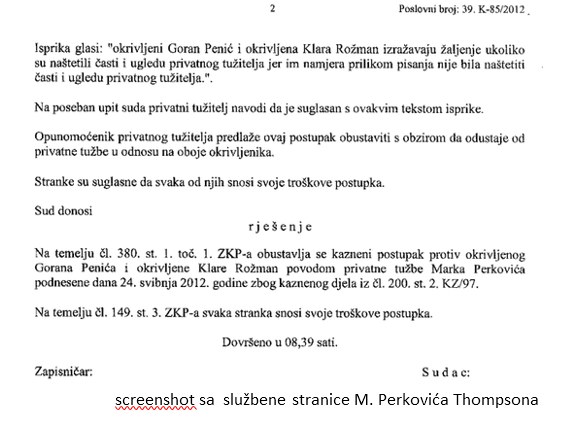 "A što se zapravo dogodilo? Još u svibnju 2012. u Jutarnjem listu objavljen je tekst o pjevaču Marku Perkoviću Thompsonu naslova u kojemu su novinari Penić i Rožman iznijeli niz neistinitih tvrdnji o tijeku poreznog postupka u kojemu je sudjelovao Thompson, pišući tako, između ostaloga, da je Thompson utajio porez, da je nezakonito primio sada već fantomski iznos od 500 tisuća eura, da nije surađivao s Poreznom upravom, da odugovlači postupak i druge neistine.