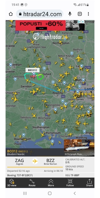 Još u srpnju 2022. pratila sam i potom pisala što se događa na zračnoj luci u Zagrebu. Tog dana 09. srpnja 2022. iza 17h, nakon brzog i neobičnog utovara desetak paleta oružja u zrakoplov koji je poletio prema zapadu, preko Njemačke, Brusellexa, pa prema Londonu, potom prema Kardifu uz zaokret natrag prema Oxfordu, izazvao je ne malu pozornost nas koji smo sve to pratili preko aplikacije.