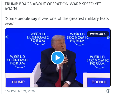 Nedavno je, u prilično iznenađujućem obratu događaja, baš u Davosu, Trump priznao da je covid bio vojna operacija. Isječak možete pogledati u nastavku. (Čini se da Substack sada dopušta ugrađivanje sadržaja s X-a, što znači da će ga strože cenzurirati):