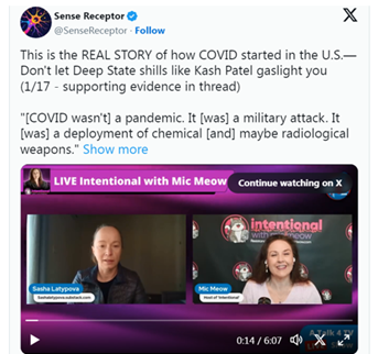Alexandra “Sasha” Latypova bivša je direktorica velike farmaceutske industrije. Njezino istraživanje otkrilo je kako su sve protumjere protiv covida, uključujući biološke ratne otrove koji se prodaju kao “cjepiva protiv covida-19”, stvorene, proizvedene i distribuirane u tajnom vojnom programu, gdje su farmaceutski proizvođači radili samo kao podizvođači. Objavljuje članke na svojoj Substack stranici 'Due Diligence and Art'.