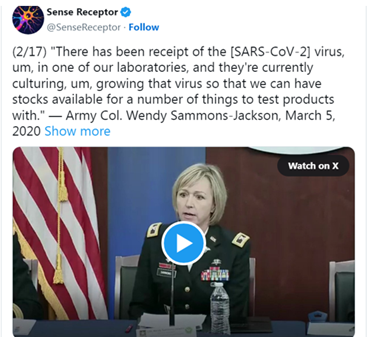 Evo isječka pukovnice Wendy Sammonds-Jackson koja objavljuje da "rastu zalihe covida" 5. ožujka 2020., kada nije bilo "covida" u SAD-u ili bilo gdje drugdje u svijetu. Ispravno tumačenje ovoga - američko Ministarstvo obrane ("DoD") (Ministarstvo rata, DoW) objavljuje da raspoređuju CBRN oružje na tlu SAD-a. Da, to je izdaja, ljudi. Trump je bio zadužen za to tada (i sada):