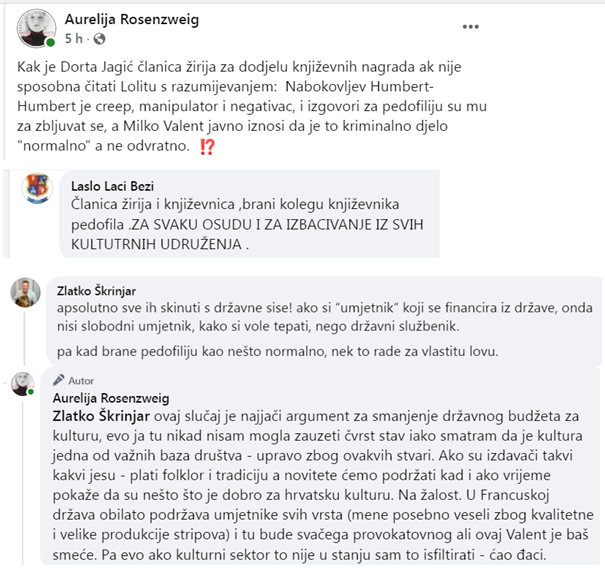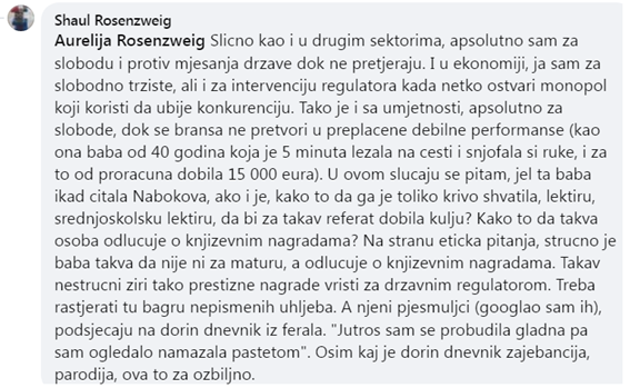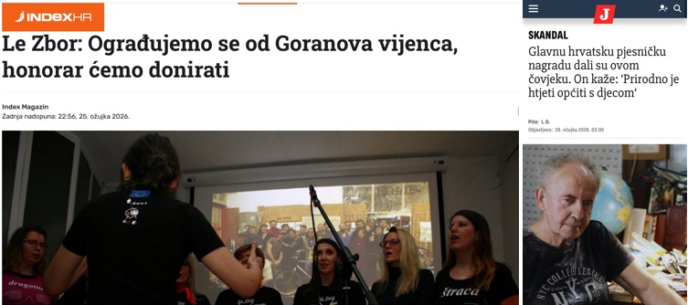 Ovom čovjeku stručni žiri dao je Goranov vijenac jer “radikalno slobodno tematizira seksualnost”. Oduzeli su nagradu tek nakon što je internet ustao na noge, skupa s queer udrugama koje toleriraju svašta, ali s pravom ne i lika koji pedofiliju trpa pod manjinske seksualne preferencije. Kako ga policija sve ove godine nije pročešljala i nešto našla ne znam, ali jedina adekvatna nagrada za njegove stihove je zatvor.