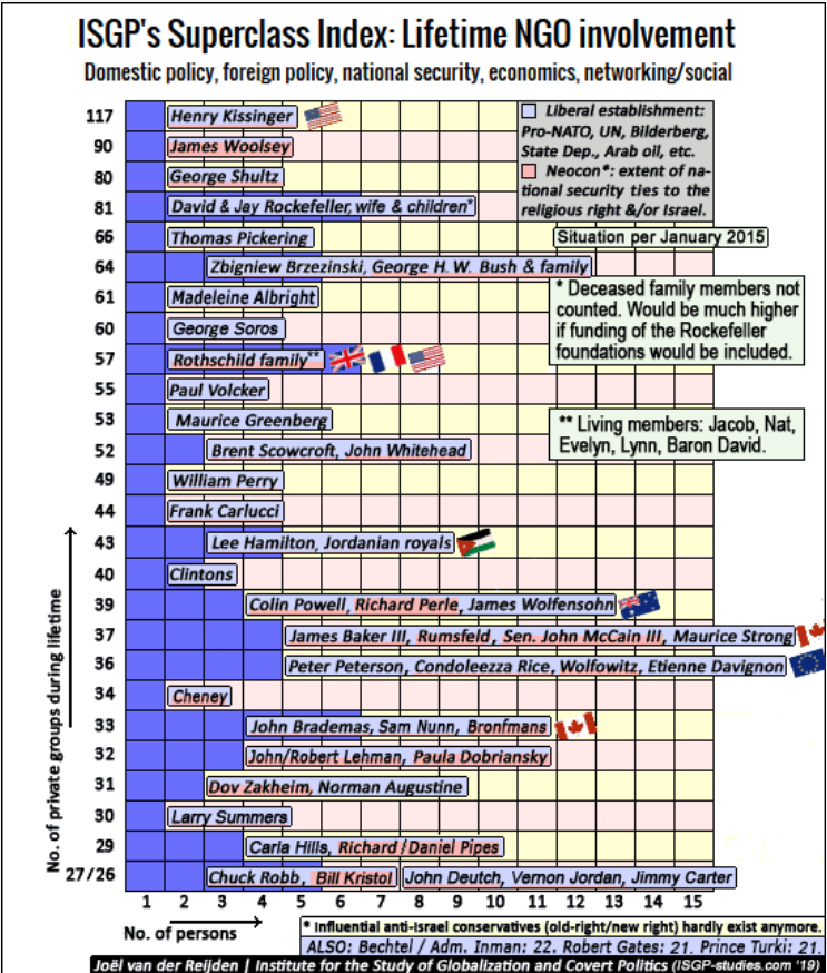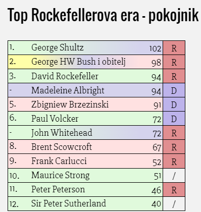 Moguće je sami provjeriti rangiranje pretraživanjem određenih (pre)imena na ovoj stranici. U ovom trenutku popisano je preko 300 još uvijek živih osoba. Stotine dodatnih "pomagača" možemo dodati ako počnemo promatrati pojedince koji su bili uključeni u manje od 10 nevladinih organizacija. Apsolutni vrh, koji uglavnom čine najbliži prijatelji pokojnog Davida Rockefellera, ipak je daleko najvažniji. Oni su izgradili i dominirali ovom globalnom mrežom barem od 1950-ih do 2020-ih.