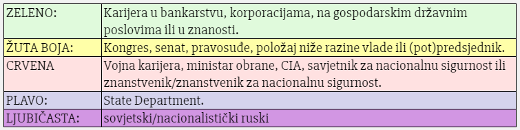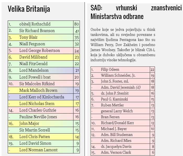 Gore navedene boje korištene su za naznaku profesionalne pozadine svake osobe. Čitatelj može nabrojati sve think tankove, zaklade i druge nevladine organizacije u koje je uključena svaka osoba na ovom popisu tako što će proći kroz ISGP-ov popis NVO-a .