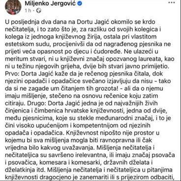 Kako je ove dane bilo bezbroj sjajnih komentara po FB koji mi je glavno „sredstvo“ doći do javnosti obzirom na potpunu blokadu, evo jedan dio jedne objave koju potpisujem, i ne samo ja. A osvrt je na objavu književnika - zamislite - Miljenka Jergovića.