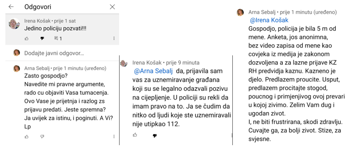 Što je to učinila Irena Košak? Prijavila me Policiji za uznemiravanje građana. Zanimljivo. Prava aktivistica. Kad se s nečim ne slažeš onda cinkariš. Ako ne strukturama režima (jer to je najčešće obzirom na suradnju istih) onda Policiji. Meni malo hodanja, davanja izjava, a njima? Materijal, prijava, koja čeka ako zatreba, kak reče nedugo jednu misao upotrebljivu u mnogim okolnostima jedan poznanik: „kad bude trenutak“!