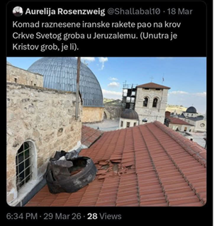 Netanyahuov ured priopćio je da je Iran nedavno gađao sveta mjesta u Jeruzalemu balističkim projektilima, a fragmenti su pali u blizini crkve, te da je bogoslužje privremeno ograničeno u Starom gradu iz sigurnosnih razloga, naglašavajući da nije bilo zlonamjerne namjere i da je potez isključivo radi zaštite uoči Uskrsnog tjedna.“