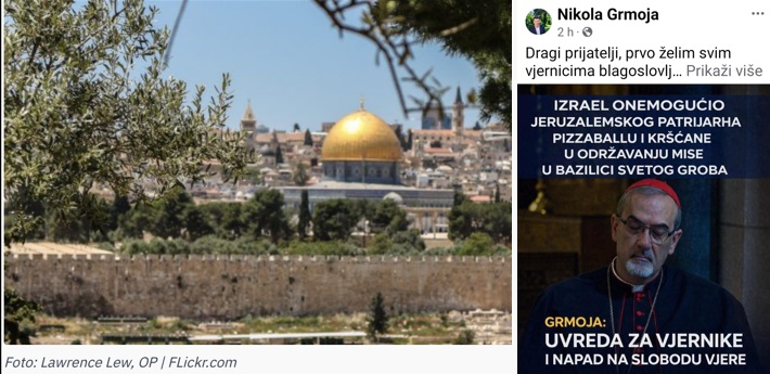 „Izrael kaže da priprema plan kojim će se crkvenim vođama dopustiti bogoslužje u Crkvi Svetog groba u nadolazećim danima nakon što je kardinalu Pierbattisti Pizzaballi zabranjen ulazak na Cvjetnicu zbog sigurnosnih razloga.