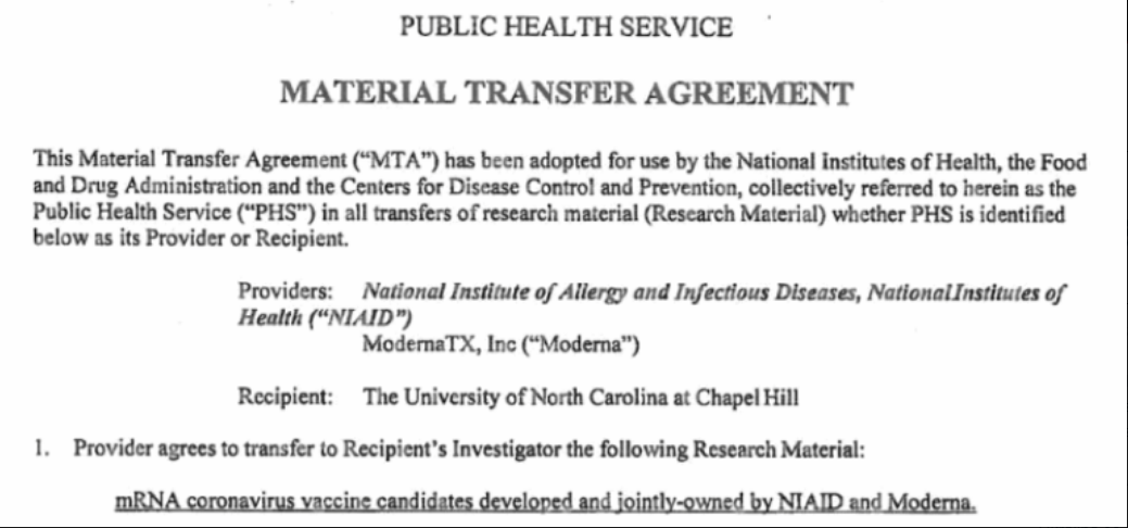 Povjerljivi ugovor koji se može pogledati ovdje navodi da su pružatelji 'Moderna' zajedno s 'Nacionalnim institutom za alergije i zarazne bolesti' (NIAID) pristali prenijeti 'mRNA kandidate za cjepivo protiv koronavirusa' koje su razvili iu zajedničkom vlasništvu NIAID-a i Moderne primateljima 'The Sveučilište Sjeverne Karoline u Chapel Hillu' 12. prosinca 2019.