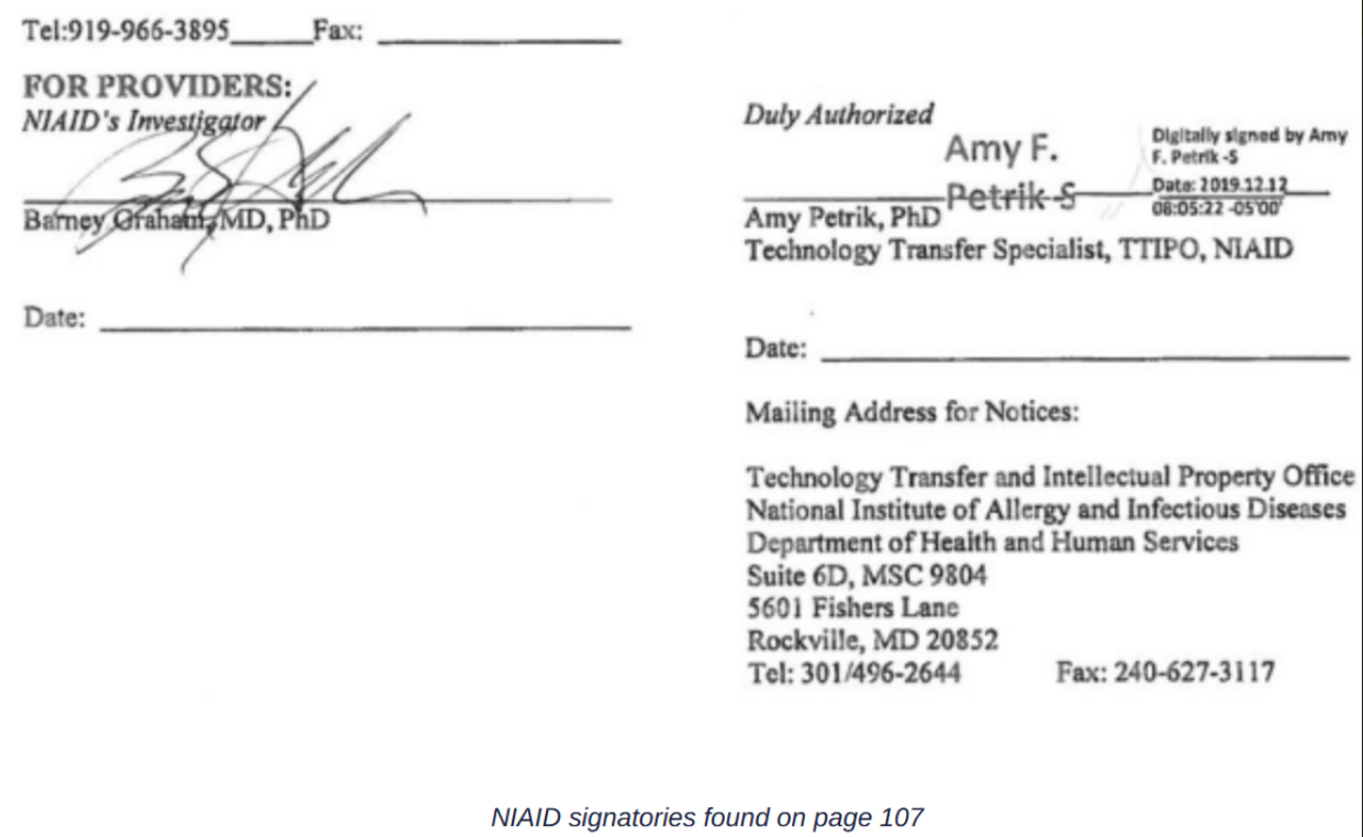 Ugovor su potpisala i dva predstavnika NIAID-a, od kojih je jedna bila dr. sc. Amy F. Petrik, specijalistica za transfer tehnologije koja je potpisala ugovor 12. prosinca 2019. u 8:05 sati. Drugi potpisnik bio je dr. sc. Barney Graham, istraživač za NIAID, međutim, ovaj potpis nije datiran.