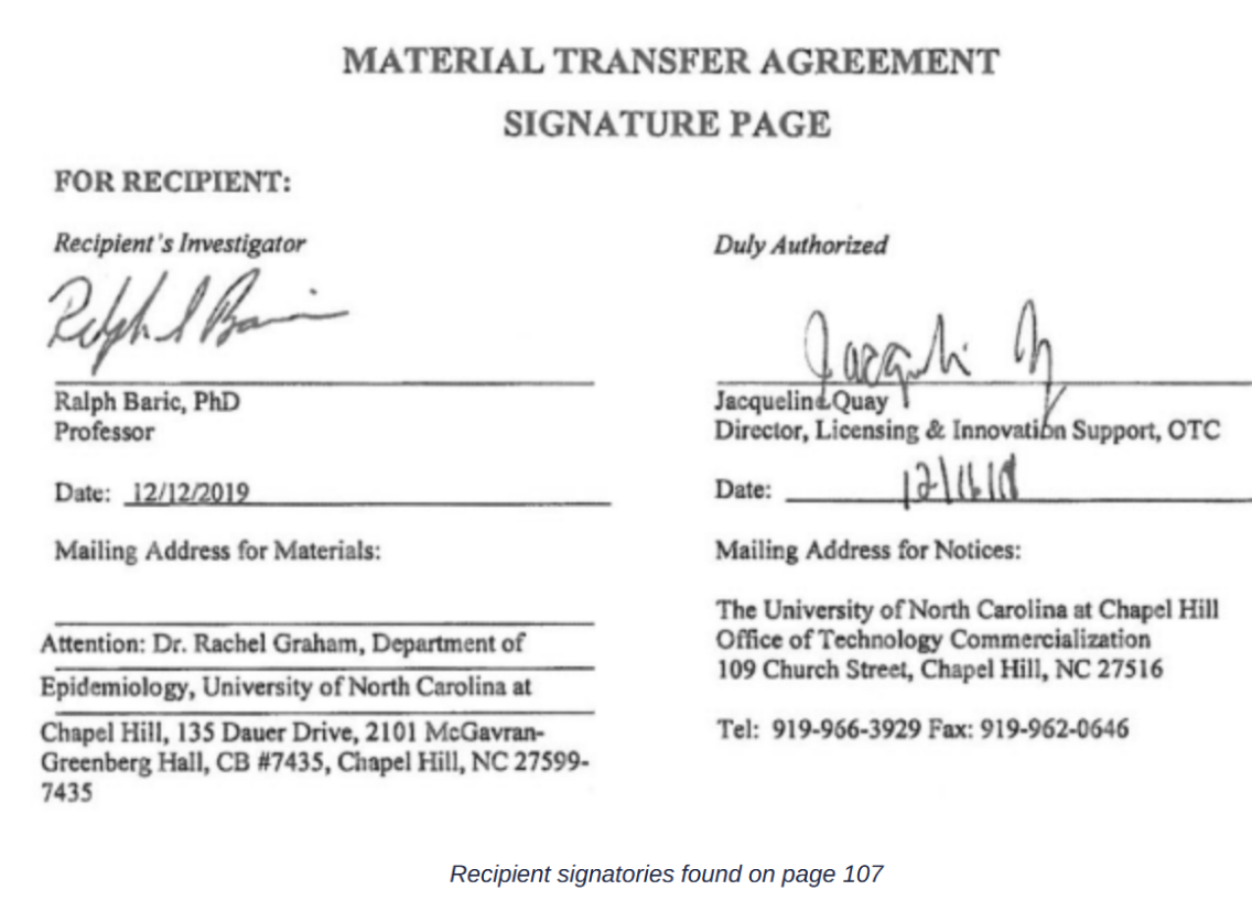 Ugovor o prijenosu materijala potpisao je 12. prosinca 2019. doktor Ralph Barić na Sveučilištu Sjeverne Karoline u Chapel Hillu, a zatim ga je 16. prosinca 2019. potpisala Jacqueline Quay, direktorica za podršku licenciranju i inovacijama na Sveučilištu Sjeverne Karoline.