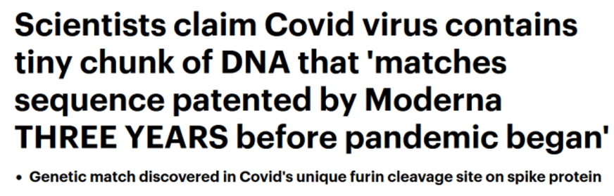 Dana 23. veljače Daily Mail je objavio članak koji pokazuje da je Moderna patentirala sekvencu od 19 baznih slova (nukleotida) koja kodira mjesto Furin Cleavage u Covid-19.