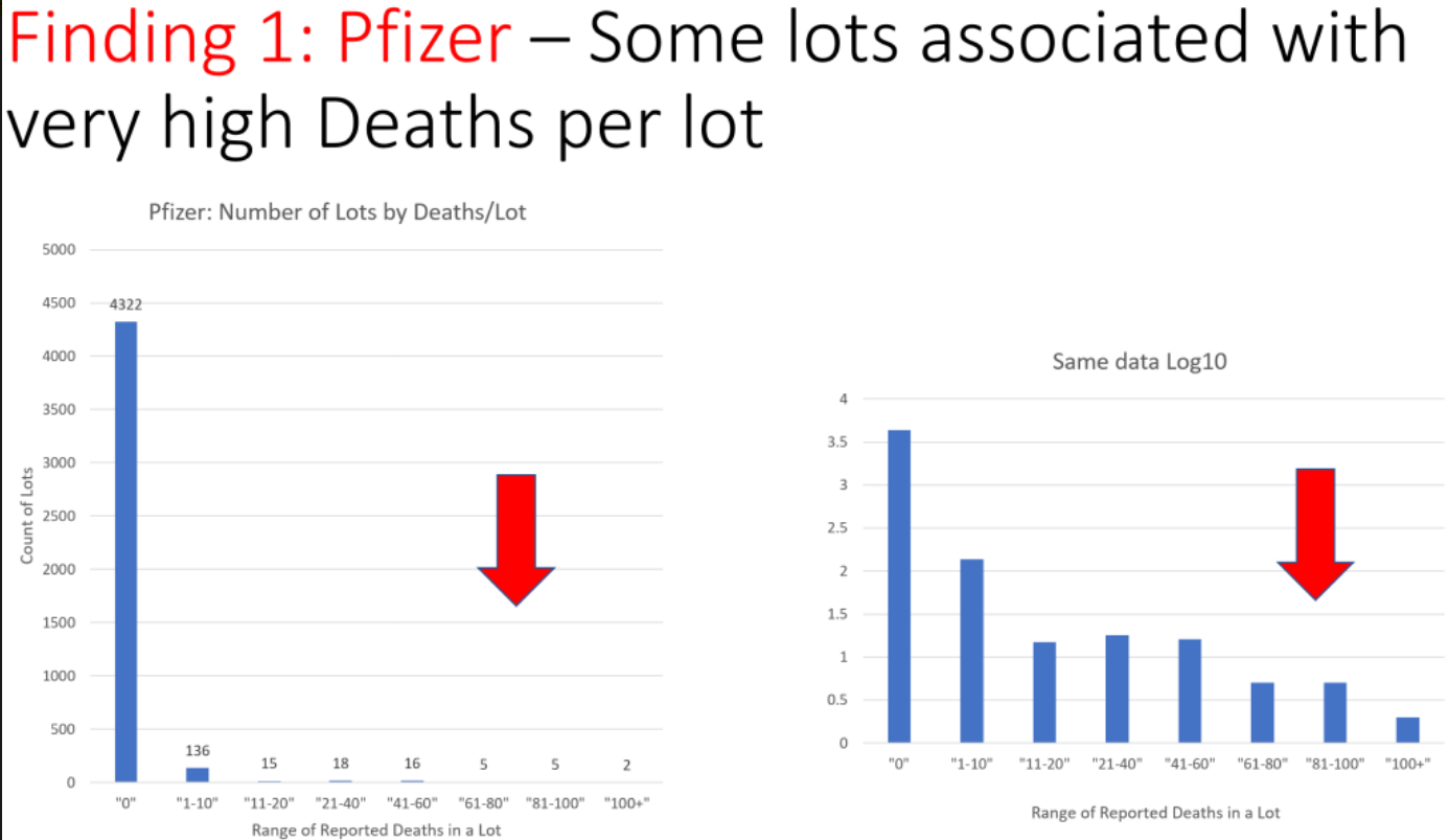 U to vrijeme, kao što možete vidjeti iz gornjeg grafikona, samo 4% proizvedenih serija Pfizer Covid-19 cjepiva bilo je odgovorno za svaki smrtni slučaj prijavljen CDC-u kao posljedica Pfizer Covid-19 cijepljenja.