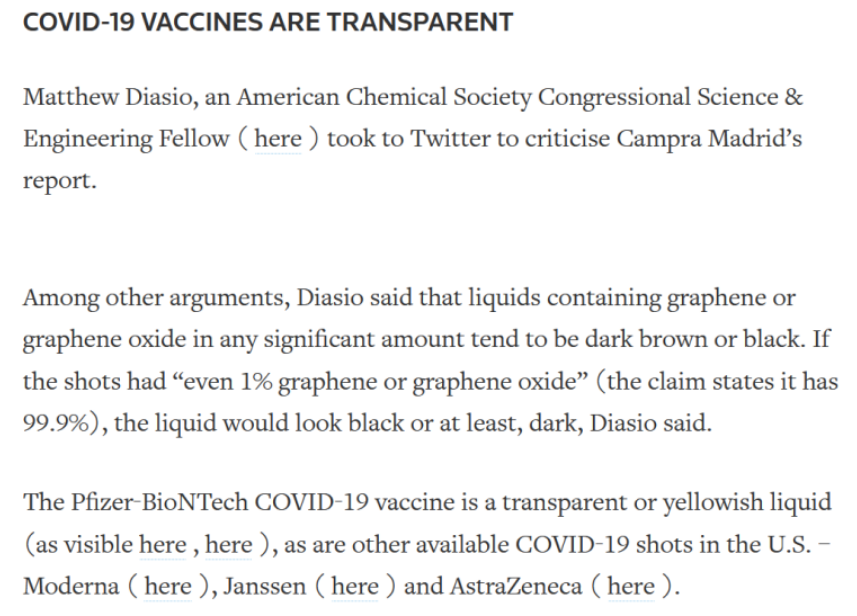 Na primjer, Reuters, koji u biti dostavlja vijesti cijelom zapadnom svijetu, a da većina ljudi to ne shvaća, izjavio je u članku o provjeri činjenica objavljenom 23. srpnja 2021. da je nemoguće da cjepiva protiv Covida sadrže grafen oksid jer bi bila ili tamnosmeđe ili crne boje, umjesto prozirne/žućkaste boje.